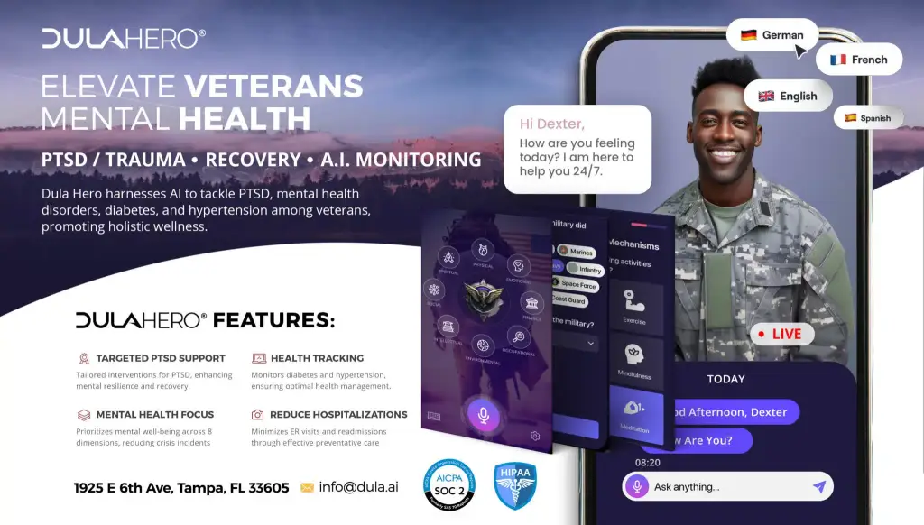 “DulaHero™ is dedicated to enhancing the lives of veterans by providing specialized support for PTSD, mental health disorders, diabetes, and hypertension. Our advanced AI-powered platform offers personalized care and monitoring, ensuring that our heroes receive the support they deserve at every step of their wellness journey.”